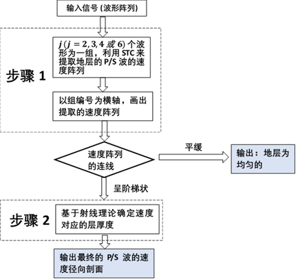 不同于同時反演速度和徑向位置兩個參數(shù)的傳統(tǒng)方法,該研究的分步反演過程分為兩個步驟進行:首先通過對聲波陣列的相鄰接收器依次采用STC(Slowness Time Coherence)方法提取速度陣列,然后基于射線理論獲得對應(yīng)速度的層厚(即徑向分布)。步驟1的反演結(jié)果可用于指導(dǎo)操作并確定步驟2是否有必要進行。
