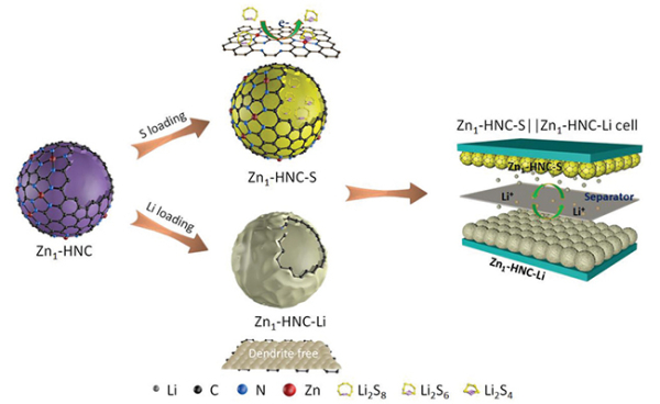 近日,中國(guó)科學(xué)院大連化學(xué)物理研究所催化基礎(chǔ)國(guó)家重點(diǎn)實(shí)驗(yàn)室二維材料化學(xué)與能源應(yīng)用研究組研究員吳忠?guī)泩F(tuán)隊(duì)與有機(jī)-無(wú)機(jī)雜化材料研究組研究員楊啟華團(tuán)隊(duì)合作,發(fā)展出一種單原子鋅修飾的中空碳球納米反應(yīng)器。該反應(yīng)器可同時(shí)用作鋰硫電池正極、負(fù)極的基體,提高對(duì)多硫化物的催化活性并抑制鋰負(fù)極枝晶的生長(zhǎng),應(yīng)用該反應(yīng)器的高比能鋰硫全電池具有高載量、高倍率、長(zhǎng)循環(huán)的性質(zhì)。