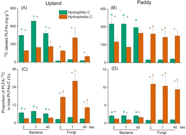 旱地和稻田土壤中親水、疏水性有機(jī)碳在細(xì)菌和真菌PLFAs的轉(zhuǎn)化量,及其在細(xì)菌和真菌總PLFAs中所占的比例