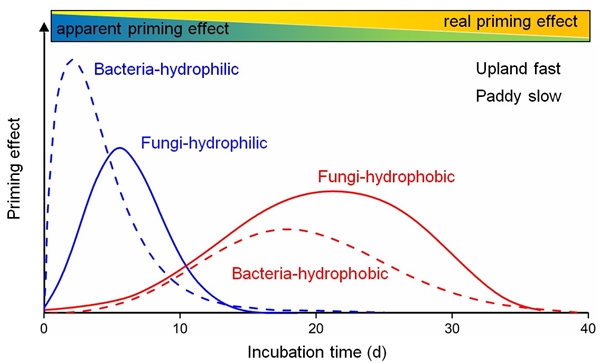 近期,中國(guó)科學(xué)院亞熱帶農(nóng)業(yè)生態(tài)研究所研究員蘇以榮團(tuán)隊(duì)以13C-標(biāo)記秸稈中提取的親水、疏水可溶性有機(jī)碳為材料,研究了親水、疏水可溶性有機(jī)碳在兩種不同土壤(旱地和水田)中的礦化及激發(fā)效應(yīng)。結(jié)果表明,培養(yǎng)前期,親水性碳本身礦化和激發(fā)效應(yīng)快于疏水性碳,對(duì)土壤有機(jī)碳礦化的累積激發(fā)量也大于疏水可溶性有機(jī)碳;培養(yǎng)結(jié)束時(shí)(40天),兩種有機(jī)碳的礦化量及其累積激發(fā)量差異不顯著。磷脂脂肪酸 (PLFAs)結(jié)果表明,兩種土壤中細(xì)菌偏好利用親水性碳,真菌偏好利用疏水性碳。根據(jù)細(xì)菌和真菌的不同生長(zhǎng)策略:細(xì)菌為快速生長(zhǎng)r-策略者、真菌為慢速生長(zhǎng)型K-策略者,其激發(fā)效應(yīng)以表觀激發(fā)和真實(shí)激發(fā)為主。研究認(rèn)為,正是由于細(xì)菌和真菌對(duì)親水和疏水性有機(jī)碳的偏好利用,導(dǎo)致前期親水性碳的礦化和激發(fā)效應(yīng)強(qiáng)度大于疏水性碳。