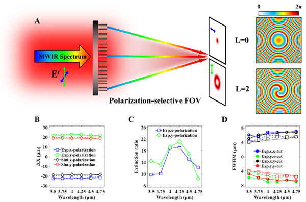 圖1(A)多功能硅基超構(gòu)表面的偏振調(diào)控寬帶消色差聚焦渦旋光束產(chǎn)生示意圖。(B)不同偏振態(tài)下光斑中心橫向位移隨波長的變化曲線。(C)不同波長下測量的偏振消光比。(D)不同波長下聚焦光斑的半高寬和理論極限。