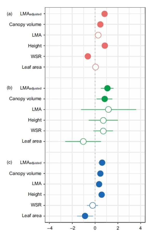功能性狀對(duì)樹種生長的相對(duì)貢獻(xiàn):a生長-性狀模型,b生長-鄰體模型,c生長-氣候-鄰體模型。