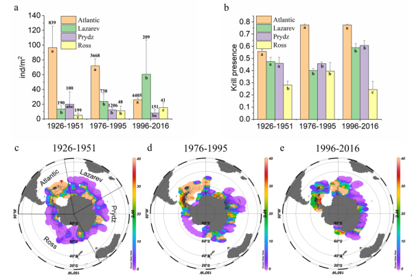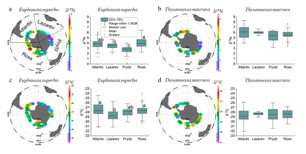 該研究由海洋所、英國普利茅斯海洋實(shí)驗(yàn)室、英國南極局、那不勒斯動(dòng)物所和墨西拿大學(xué)完成,海洋所副研究員楊光為論文第一作者,研究員李超倫為論文通訊作者。研究人員整合2013/2014中國第30次南極科學(xué)考察(Discovery航次之后的單季節(jié)環(huán)南極航次)南極磷蝦樣品數(shù)據(jù)、KRILLBASE南極磷蝦數(shù)據(jù)庫(1926-2016)和南極磷蝦穩(wěn)定同位素元數(shù)據(jù)等大數(shù)據(jù)庫。研究工作得到國家重點(diǎn)研發(fā)計(jì)劃、國家自然科學(xué)基金、世界自然基金會(huì)等的支持。