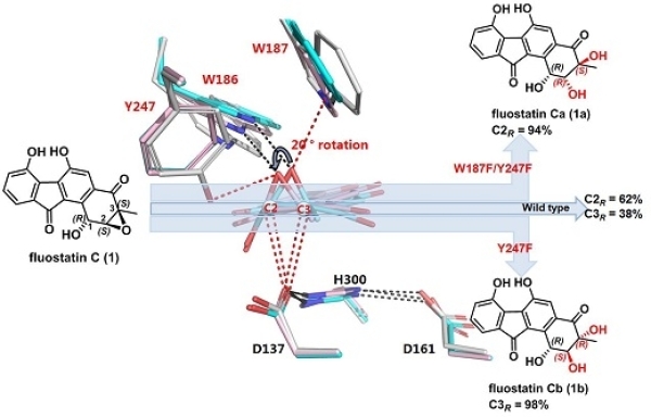環(huán)氧水解酶(EH)能夠選擇性催化環(huán)氧化物的不對稱水解反應(yīng),根據(jù)親核進(jìn)攻位點(diǎn)的不同可產(chǎn)生構(gòu)型不同的手性鄰二醇。因此,研究EH位點(diǎn)選擇性開環(huán)機(jī)理在天然產(chǎn)物生物合成和手性藥物有機(jī)合成中具有重要意義。該研究團(tuán)隊前期發(fā)現(xiàn)來自于kinamycin生物合成基因簇的α/β家族EH Alp1U 可催化fluostatin(FST)類天然產(chǎn)物FST C (1)環(huán)氧開環(huán),但不具備開環(huán)位點(diǎn)選擇性,可得到兩種環(huán)氧開環(huán)產(chǎn)物。該研究通過多種譜學(xué)、化學(xué)衍生和理論計算確定了兩種環(huán)氧開環(huán)產(chǎn)物1a和1b的立體構(gòu)型,分別對應(yīng)于在FST C (1)的C2位和C3位環(huán)氧開環(huán)。