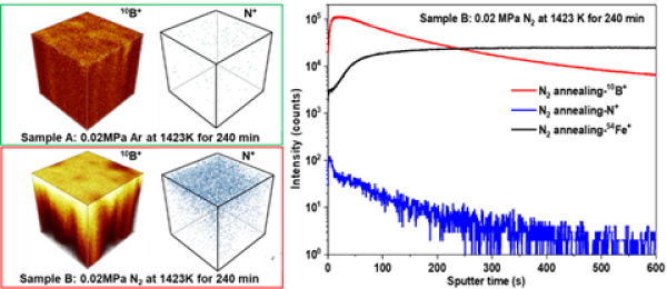 圖2.基于飛行時間二次離子質(zhì)譜(ToF-SIMS)的Fe2B合金淺表層B原子和N原子分布規(guī)律研究