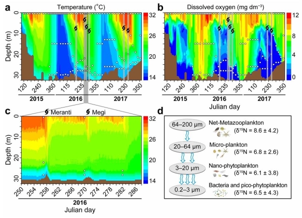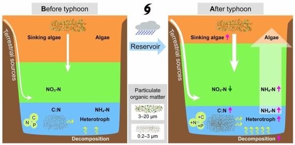中國(guó)科學(xué)院城市環(huán)境研究所水生態(tài)健康研究組研究員楊軍團(tuán)隊(duì)選擇亞熱帶深水型水庫(kù)為研究對(duì)象,進(jìn)行了為期三年的研究,以闡明環(huán)境變化、顆粒有機(jī)物的穩(wěn)定同位素和化學(xué)計(jì)量、以及營(yíng)養(yǎng)循環(huán)對(duì)臺(tái)風(fēng)的響應(yīng)及其內(nèi)在相互關(guān)系。結(jié)果顯示,臺(tái)風(fēng)顯著改變了深層水體的營(yíng)養(yǎng)水平以及溫躍層深度,導(dǎo)致水庫(kù)表層水溫降低、底層水溫升高。臺(tái)風(fēng)后短期(如臺(tái)風(fēng)后的前10天)內(nèi),中層水體顆粒有機(jī)物濃度大于底層水體,而隨后底層水體顆粒有機(jī)物濃度快速升高,并逐漸超過(guò)中層水體;而且,中層水體顆粒有機(jī)物的濃度在臺(tái)風(fēng)后短期內(nèi)顯著增加,但隨后又迅速下降恢復(fù)至臺(tái)風(fēng)前的濃度水平,這伴隨了底層顆粒有機(jī)物(藻類(lèi)和死亡有機(jī)物)的積累和濃度的持續(xù)增加,表明臺(tái)風(fēng)后有機(jī)物(包括藻類(lèi))沉降是底層有機(jī)物的主要來(lái)源。隨機(jī)森林和路徑分析結(jié)果同樣表明,葉綠素a與中層和底層水體的顆粒有機(jī)物和營(yíng)養(yǎng)循環(huán)顯著相關(guān),因此臺(tái)風(fēng)事件驅(qū)動(dòng)的陸源有機(jī)物輸入增加、藻類(lèi)沉降和細(xì)菌異養(yǎng)分解共同作用,導(dǎo)致水庫(kù)底層水體中總氮、銨態(tài)氮和總磷急劇增加且長(zhǎng)期維持高濃度,進(jìn)而增加水庫(kù)和下游水體富營(yíng)養(yǎng)化的威脅。臺(tái)風(fēng)后,底層水體的微微型顆粒有機(jī)物(0.2–3 μm)顯著增加,該粒徑的顆粒有機(jī)物對(duì)臺(tái)風(fēng)的響應(yīng)比其他粒徑的顆粒有機(jī)物(3–20、20–64、64–200 μm)更加強(qiáng)烈,并且臺(tái)風(fēng)后第一個(gè)月內(nèi)微微型顆粒有機(jī)物一直保持較高的水平。進(jìn)一步分析表明,微微型顆粒有機(jī)物的濃度和計(jì)量學(xué)比值(如碳氮比和氮磷比)是底層水體營(yíng)養(yǎng)循環(huán)的重要指標(biāo),顆粒有機(jī)物的氮同位素與氨氮濃度顯著相關(guān),說(shuō)明臺(tái)風(fēng)促進(jìn)了底層水體的氮循環(huán)過(guò)程,造成氨氮的持續(xù)積累。臺(tái)風(fēng)后底層水體微微型顆粒有機(jī)物的C:N比值的增加可以降低營(yíng)養(yǎng)級(jí)之間的能量傳遞,有利于底層水體中的異養(yǎng)分解過(guò)程,而且顆粒有機(jī)物的穩(wěn)定同位素和濃度對(duì)底層營(yíng)養(yǎng)循環(huán)具有直接效應(yīng),這些證據(jù)表明,臺(tái)風(fēng)主要通過(guò)微微型的顆粒有機(jī)物(含細(xì)菌)促進(jìn)深層水體的營(yíng)養(yǎng)循環(huán)。因此,臺(tái)風(fēng)后,底層水體有機(jī)物輸入的增加和營(yíng)養(yǎng)循環(huán)的加速增加了深水水庫(kù)富營(yíng)養(yǎng)化和有害藻類(lèi)水華發(fā)生的風(fēng)險(xiǎn)。