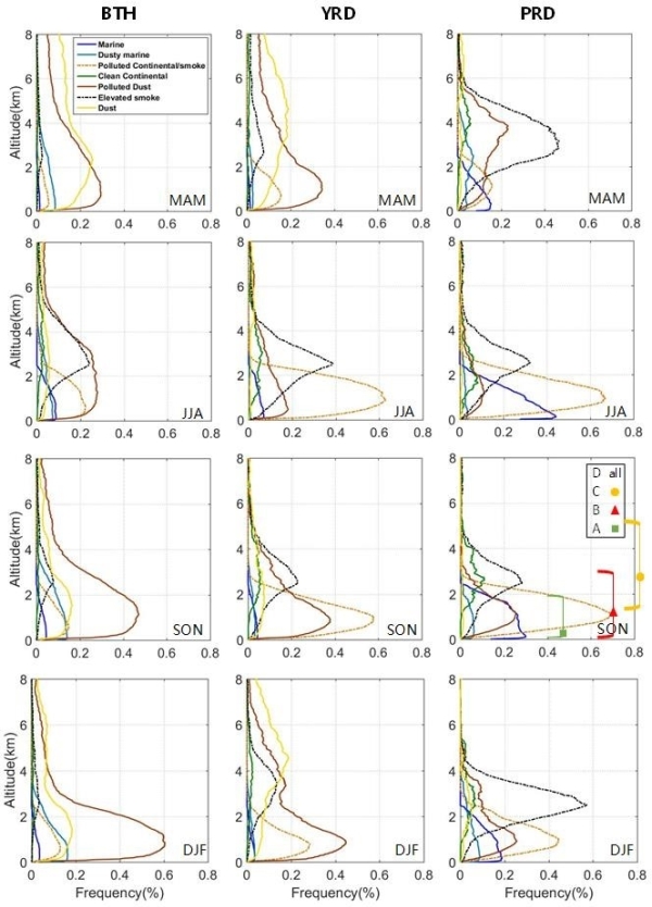 2007至2020年中國三大城市群不同季節(jié)氣溶膠類型的垂直分布情況