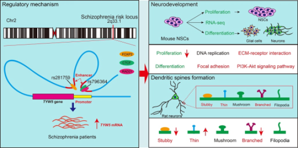 為了進(jìn)一步闡明這2個(gè)功能遺傳變異在精神分裂癥中的潛在作用和機(jī)制,羅雄劍課題組開展了系列研究。遺傳學(xué)研究證實(shí)這2個(gè)功能遺傳變異在東亞人群中與精神分裂癥顯著相關(guān),ENCODE的ChIP-Seq、DNase-Seq及組蛋白修飾數(shù)據(jù)表明,這2個(gè)功能遺傳變異位于具有轉(zhuǎn)錄活性調(diào)控區(qū)域(即調(diào)控元件)內(nèi),并與CTCF、RAD21和FOXP2轉(zhuǎn)錄因子結(jié)合。進(jìn)一步的雙熒光素酶報(bào)告基因?qū)嶒?yàn)、凝膠遷移阻滯實(shí)驗(yàn)(Electrophoretic mobility shift assay,EMSA)、人類大腦表達(dá)數(shù)量性狀基因座(Expression quantitative trait locus,eQTL)分析、CRISPR-Cas9介導(dǎo)的基因組編輯、轉(zhuǎn)錄因子敲降實(shí)驗(yàn)以及腦部Hi-C數(shù)據(jù)表明,rs796364和rs281759可能通過干擾CTCF、RAD21和FOXP2結(jié)合來調(diào)控遠(yuǎn)端基因TYW5表達(dá)。與正常人相比,TYW5在精神分裂癥患者腦中表達(dá)顯著上調(diào),提示TYW5在精神分裂癥中具有關(guān)鍵作用。神經(jīng)干細(xì)胞實(shí)驗(yàn)進(jìn)一步揭示TYW5過表達(dá)影響細(xì)胞增殖和分化,表明TYW5在神經(jīng)發(fā)育中起到重要作用。同時(shí),神經(jīng)元樹突棘形態(tài)分析發(fā)現(xiàn),TYW5過表達(dá)影響樹突棘密度和比例,表明TYW5在神經(jīng)元樹突棘形成中可能發(fā)揮重要作用。TYW5過表達(dá)與正常神經(jīng)干細(xì)胞的轉(zhuǎn)錄組分析提示,其差異表達(dá)基因主要富集在DNA復(fù)制等生物學(xué)通路中,且KEGG分析提示TYW5調(diào)控與精神分裂癥相關(guān)信號(hào)通路,包括細(xì)胞外基質(zhì)(ECM)受體互作通路、黏附斑(Focal adhesion)和PI3K-Akt通路。該研究表明功能遺傳變異rs796364和rs281759可能通過影響轉(zhuǎn)錄因子(CTCF、RAD21和FOXP2)結(jié)合來調(diào)控遠(yuǎn)端基因TYW5表達(dá),進(jìn)而影響神經(jīng)發(fā)育和樹突棘形態(tài)發(fā)生,導(dǎo)致精神分裂癥易感。