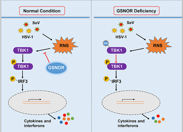 天然免疫是機(jī)體抵御病毒感染的第一道防線。宿主細(xì)胞利用模式識(shí)別受體識(shí)別病毒入侵,通過一系列信號(hào)轉(zhuǎn)導(dǎo)激活I(lǐng)FN表達(dá),進(jìn)而抑制病毒感染。在細(xì)胞質(zhì)中,分別由RIG-I樣受體和cGAS識(shí)別RNA和DNA病毒,RIG-I樣受體通過接頭分子MAVS向下游傳遞信號(hào),而cGAS通過STING向下游傳遞信號(hào)。MAVS和STING都招募TBK1,TBK1可以磷酸化IRF3,進(jìn)而誘導(dǎo)IFN表達(dá)。機(jī)體精確調(diào)控天然免疫信號(hào)通路中的關(guān)鍵分子,實(shí)現(xiàn)自身穩(wěn)態(tài)維持。常見的調(diào)控是對(duì)抗病毒蛋白翻譯后修飾的調(diào)控,如磷酸化和泛素化修飾等。蛋白質(zhì)巰基亞硝基化(S-nitrosation)是一種基于氧化還原的蛋白質(zhì)翻譯后修飾,可利用改變蛋白構(gòu)象、穩(wěn)定性、亞細(xì)胞定位和生物化學(xué)活性等方式,調(diào)節(jié)多種生理和病理過程。GSNOR是一種進(jìn)化上高度保守的亞硝基化谷胱甘肽(GSNO)的還原酶,通過代謝GSNO進(jìn)而調(diào)節(jié)蛋白質(zhì)巰基亞硝基化。