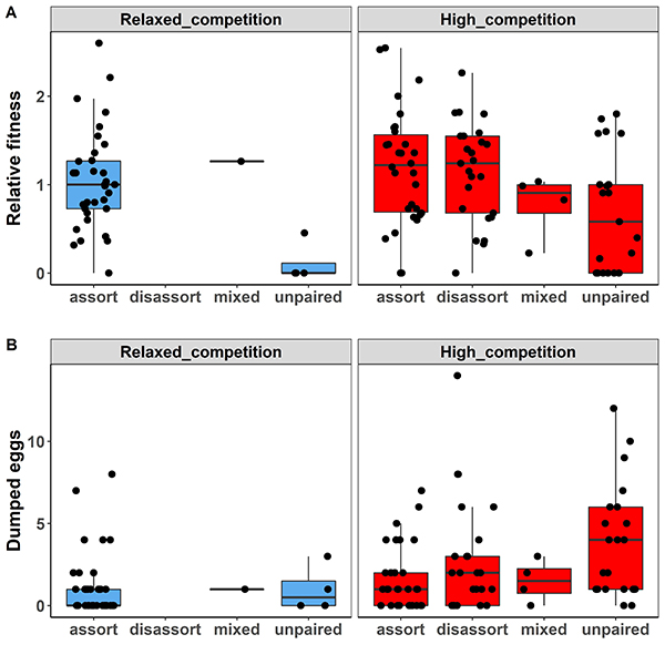 圖3.相對適合度和“種內(nèi)巢寄生”分別與不同的配對模式的關(guān)系