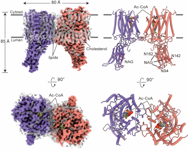硫酸乙酰肝素(HS)是位于細(xì)胞表面和細(xì)胞外基質(zhì)中最重要的糖胺聚糖之一,在一系列生物過(guò)程中發(fā)揮關(guān)鍵作用,如發(fā)育、炎癥、血管生成、細(xì)胞生長(zhǎng)和病毒感染。HS的降解需要多種溶酶體酶的協(xié)同作用。其中,乙酰肝素-α-氨基葡萄糖N-乙酰轉(zhuǎn)移酶(HGSNAT)是HS降解中唯一的非水解酶和溶酶體跨膜蛋白酶,催化HS末端氨基葡萄糖的跨膜乙?;瑥亩M(jìn)一步裂解。HGSNAT功能障礙導(dǎo)致HS在多個(gè)細(xì)胞和組織的溶酶體中積累,致使神經(jīng)性溶酶體貯積?。↙SD)——粘多糖癥ⅢC。粘多糖貯積癥表現(xiàn)為神經(jīng)功能惡化、多動(dòng)、睡眠障礙、聽(tīng)力喪失和兒童癡呆。目前,這一疾病尚無(wú)較好的治療方法,因此闡明HGSNAT的結(jié)構(gòu)對(duì)于開(kāi)發(fā)藥物伴侶以及靶向HGSNAT治療粘多糖癥ⅢC至關(guān)重要。