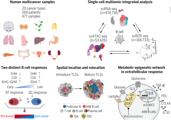 這一成果創(chuàng)新性地描繪了多癌種B細(xì)胞的轉(zhuǎn)錄組、BCR免疫組庫和表觀組的單細(xì)胞多組學(xué)圖譜,揭示了腫瘤浸潤B細(xì)胞存在抗腫瘤與促腫瘤不同的應(yīng)答模式,并分析了腫瘤浸潤AtM B細(xì)胞的分子特征、分化路徑、空間定位、癌種特異性及臨床相關(guān)性,提出了靶向抑制濾泡外B細(xì)胞應(yīng)答、促進(jìn)抗腫瘤免疫的免疫治療新方向。