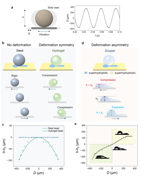 液滴表現(xiàn)出不同于剛體和水凝膠的振動(dòng)行為,能夠在浸潤(rùn)性圖案的調(diào)控下將對(duì)稱的振動(dòng)輸入轉(zhuǎn)化為不對(duì)稱的振動(dòng)輸出