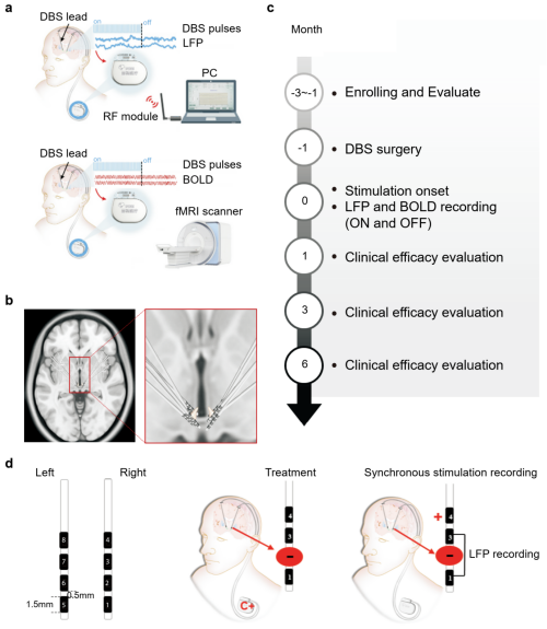 為研究韁核刺激減輕人類(lèi)抑郁癥狀的臨床療效和神經(jīng)機(jī)制,中國(guó)科學(xué)院心理研究所與清華大學(xué)神經(jīng)調(diào)控國(guó)家工程研究中心、中國(guó)人民解放軍第一醫(yī)學(xué)中心合作,在6例難治性抑郁癥患者的雙側(cè)韁核植入腦深部刺激電極,隨后給予高頻持續(xù)刺激治療難治性抑郁癥患者,并在首次腦深部刺激開(kāi)機(jī)時(shí)探討了急性刺激韁核對(duì)韁核局部神經(jīng)活動(dòng)及相關(guān)獎(jiǎng)賞環(huán)路關(guān)鍵腦區(qū)的影響。相關(guān)研究成果發(fā)表在Nature Mental Health上。