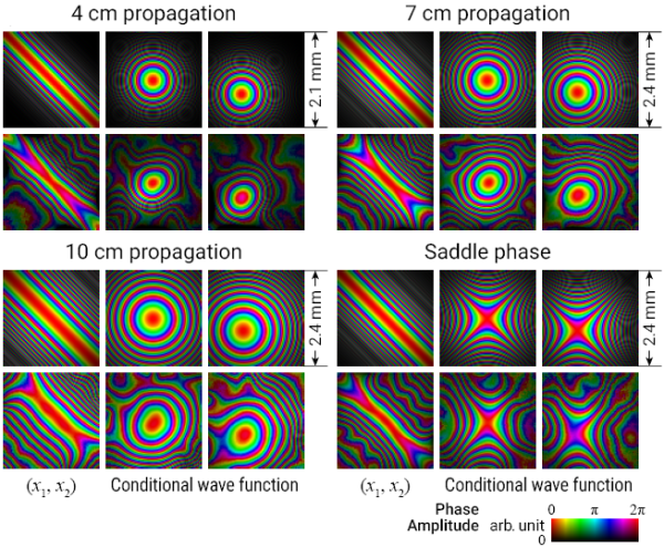 經(jīng)典光學(xué)中,夏克–哈特曼波前傳感是廣泛使用的相位測量方法。該方法使用微透鏡陣列,將光場在局部空間的傳播方向轉(zhuǎn)換為聚焦光斑的位移,從而測量得到光場相位梯度的分布,并重構(gòu)出相位。同時(shí),它的空間分辨率由透鏡尺寸決定。該團(tuán)隊(duì)受此啟發(fā),提出并實(shí)現(xiàn)了量子夏克–哈特曼波前傳感器,觀測到位置糾纏光子對空間波函數(shù)的動力學(xué)演化。雙光子射入透鏡陣列后,在其后焦面探測雙光子的聯(lián)合空間概率分布。研究發(fā)現(xiàn),通過對單個(gè)微透鏡孔徑內(nèi)所有點(diǎn)的條件概率分布求和并利用梯度算法可以重構(gòu)出相位,結(jié)合強(qiáng)度分布即可得到雙光子空間波函數(shù)。該團(tuán)隊(duì)測量了自發(fā)參量下轉(zhuǎn)換產(chǎn)生的光子對在自由空間不同演化時(shí)間的空間波函數(shù),觀測到雙光子在自由空間傳播過程中振幅關(guān)聯(lián)逐漸變?nèi)醵辔魂P(guān)聯(lián)逐漸變強(qiáng)的過程。進(jìn)一步,該團(tuán)隊(duì)測量了雙光子在動量空間使用空間光調(diào)制器加載雙曲拋物面相位后的波函數(shù)。