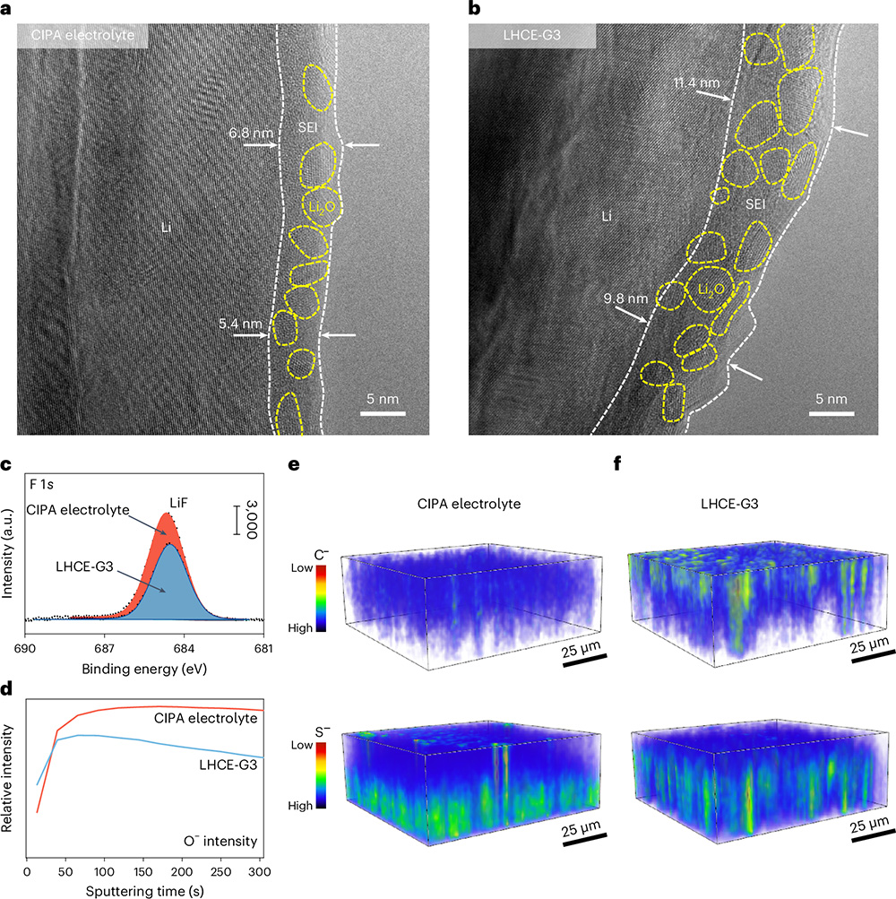 該工作采用冷凍透射電子顯微鏡,結(jié)合一系列先進(jìn)的表面分析技術(shù),研究固態(tài)電解質(zhì)界面膜的結(jié)構(gòu)、成分和空間分布。在結(jié)構(gòu)上,CIPA電解液在鋰金屬負(fù)極表面形成薄且均勻的SEI膜。該膜平均厚度約為6.2 nm,低于局部高濃電解液中所形成的SEI膜。兩種電解液中形成的SEI膜都表現(xiàn)出有機(jī)–無機(jī)復(fù)合結(jié)構(gòu),其中CIPA電解液所形成的SEI膜中Li2O納米晶粒尺寸和分布表現(xiàn)出更高的均勻性。在成分上,與CIPA電解液相比,LHCE-G3電解液形成的SEI中LiF含量較少且C-和O-的信號(hào)更強(qiáng),表明FSI?陰離子分解減少,溶劑分解更為嚴(yán)重。在空間分布上,CIPA電解液衍生的SEI膜中C-和S-元素從內(nèi)到外分布更加均勻,而LHCE-G3電解液在SEI膜的外層檢測到明顯的C-信號(hào),而S-信號(hào)則在內(nèi)層集中,說明LHCE-G3電解液的還原行為是不均勻的,這會(huì)引發(fā)局部的鋰沉積,導(dǎo)致鋰枝晶的形成。研究綜合界面表征結(jié)果發(fā)現(xiàn),CIPA電解液中FSI?陰離子通過集體電子轉(zhuǎn)移機(jī)制迅速還原,形成富含LiF和Li2O且低有機(jī)含量的SEI膜。這種穩(wěn)定的SEI層為鋰金屬負(fù)極提供了有效保護(hù),防止了進(jìn)一步的副反應(yīng),從而增強(qiáng)了鋰金屬電池的循環(huán)穩(wěn)定性和安全性。