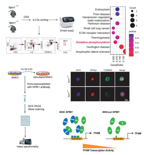 近日,中國(guó)科學(xué)院蘇州生物醫(yī)學(xué)工程技術(shù)研究所孫敏軒團(tuán)隊(duì)發(fā)現(xiàn)骨髓增生異常綜合征和急性髓系白血病中的驅(qū)動(dòng)分子核磷蛋白(NPM1)在炎癥性腸病和結(jié)直腸癌的發(fā)生發(fā)展中發(fā)揮了關(guān)鍵作用,揭示了NPM1通過(guò)調(diào)節(jié)3型固有淋巴細(xì)胞線粒體功能以影響其腸道穩(wěn)態(tài)調(diào)控作用的分子機(jī)制。這一成果為炎癥性腸病及其相關(guān)結(jié)直腸癌的發(fā)病機(jī)制以及炎癥性腸病與骨髓增生異常綜合征和急性髓系白血病的聯(lián)系提供了新的理論依據(jù),并為炎癥性腸病和結(jié)直腸癌患者提供了新的預(yù)后標(biāo)志物和免疫治療靶點(diǎn)。