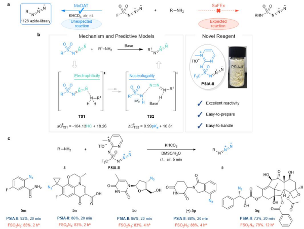 (a)氟磺酰疊氮對伯胺進(jìn)行模塊化重氮轉(zhuǎn)移的意外發(fā)現(xiàn);(b)重氮轉(zhuǎn)移反應(yīng)的活性預(yù)測模型和新型重氮轉(zhuǎn)移試劑;(c)PSIA-II試劑用于天然產(chǎn)物和藥物的快速修飾
