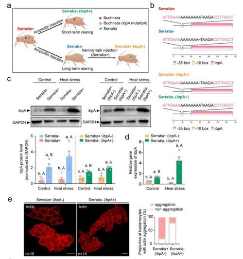 研究發(fā)現(xiàn),Buchnera編碼的小熱激蛋白ibpA是維持菌胞熱穩(wěn)定性和蚜蟲高溫耐受力的關(guān)鍵蛋白。在蚜蟲經(jīng)歷熱脅迫后,ibpA與菌胞的細(xì)胞骨架actin發(fā)生互作,避免actin變性聚集,從而提高菌胞熱穩(wěn)定性。而ibpA啟動(dòng)子區(qū)連續(xù)11個(gè)腺苷酸極易發(fā)生單核苷酸缺失突變,不利于ibpA的熱誘導(dǎo)表達(dá)。兼性共生菌Serratia的侵染可以降低Buchnera基因組中的突變頻率,抑制ibpA啟動(dòng)子區(qū)單核苷酸缺失的產(chǎn)生,進(jìn)而維持ibpA熱誘導(dǎo)效率,提高蚜蟲的高溫適應(yīng)性。