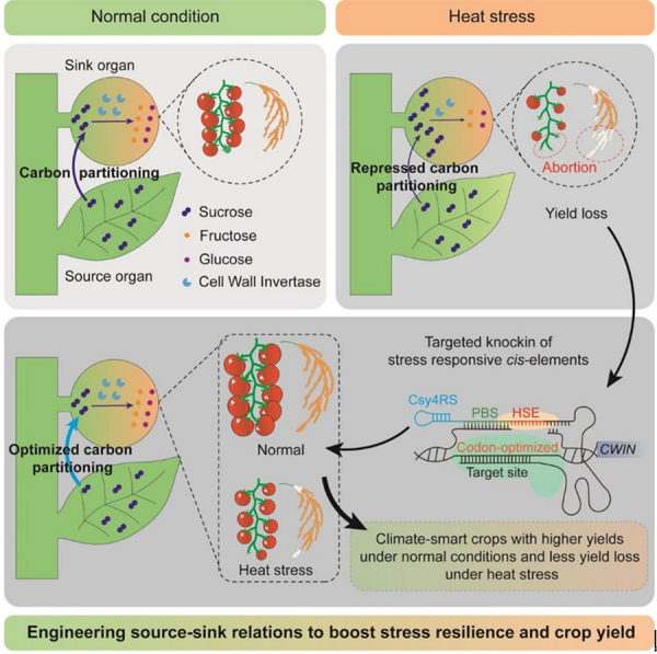 中國科學(xué)院遺傳與發(fā)育生物學(xué)研究所許操團(tuán)隊基于植物生理學(xué)經(jīng)典理論“源庫理論”即植物體內(nèi)光合產(chǎn)物從“源”器官向“庫”器官的運(yùn)輸與分配過程,發(fā)展出環(huán)境智能型高產(chǎn)-穩(wěn)產(chǎn)作物設(shè)計育種新策略(CROCS)。12月14日,相關(guān)研究成果以Engineering source–sink relations by prime editing confers heat-stress resilience in tomato and rice為題,發(fā)表在《細(xì)胞》(Cell)上。這一成果是我國在高產(chǎn)穩(wěn)產(chǎn)作物育種核心技術(shù)方面取得的重要進(jìn)展。