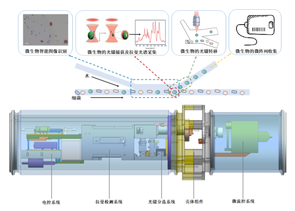 該團(tuán)隊(duì)基于拉曼、光鑷和微流控技術(shù),研發(fā)出能夠原位、實(shí)時(shí)、快速檢測(cè)并分選深海微生物的儀器設(shè)備,突破了拉曼檢測(cè)技術(shù)和光鑷分選技術(shù)在1500米級(jí)深海的應(yīng)用,實(shí)現(xiàn)了對(duì)深海微生物的原位拉曼檢測(cè)與光鑷分選,填補(bǔ)了國(guó)內(nèi)外應(yīng)對(duì)深海極端環(huán)境原位檢測(cè)與分選深海微生物設(shè)備的空白。