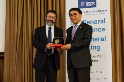 白春禮為國際理論物理中心主任費爾南多·克韋多頒發(fā)TWAS薩拉姆獎?wù)拢≒aola Di Bella 攝)
