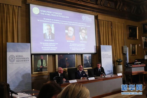 10月8日,在瑞典斯德哥爾摩,瑞典皇家科學(xué)院公布2019年諾貝爾物理學(xué)獎(jiǎng)獲得者。新華社記者鄭煥松攝