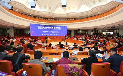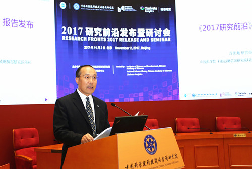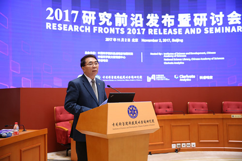 會(huì)上,中科院戰(zhàn)略研究院研究員冷伏海做了《2017研究前沿》發(fā)布報(bào)告;戰(zhàn)略研究院院長、研究員潘教峰做了“《2017研究前沿?zé)岫戎笖?shù)》及中國表現(xiàn)卓越的研究前沿”發(fā)布報(bào)告,評(píng)估了世界主要國家在10個(gè)領(lǐng)域的100個(gè)熱點(diǎn)前沿和43個(gè)新興前沿的研究活躍程度。