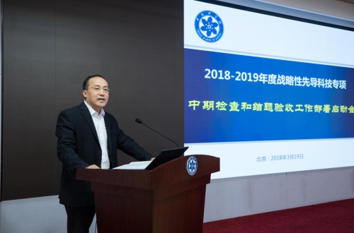 3月19日,中國科學(xué)院在北京組織召開2018-2019年度戰(zhàn)略性先導(dǎo)科技專項中期檢查和結(jié)題驗收工作部署啟動會。中科院副院長、黨組成員張濤出席會議并講話。院機(jī)關(guān)相關(guān)部門、各先導(dǎo)專項、依托單位負(fù)責(zé)人和專項管理人員代表共180余人參加會議。