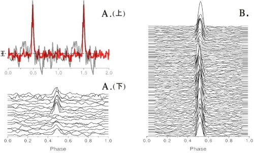新脈沖星的歸一化平均脈沖輪廓和單脈沖:A(上)為FP1平均脈沖輪廓,F(xiàn)AST通過約52.4秒漂移掃描(紅色)產(chǎn)生信噪比為Parkes望遠鏡L波段積分2100秒結(jié)果(灰色)信噪比的3倍,表現(xiàn)出FAST高靈敏度優(yōu)勢;A(下)為FP1單脈沖輪廓;B為FAST采用跟蹤觀測5分鐘,獲得的另一顆新脈沖星FP2的單脈沖輪廓。