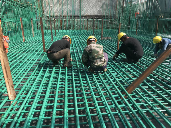 工人在現(xiàn)場(chǎng)編織環(huán)氧涂層鋼筋