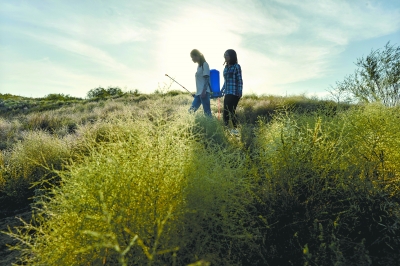 8日下午,頂著3時(shí)多的太陽,韓迎春和李琪背著40斤的水桶,走上20多分鐘,進(jìn)入到叢林深處的沙地,經(jīng)過近20年荒漠藻種植,基地周邊已形成高高低低的灌木叢林,要找上一片未被荒漠藻覆蓋的沙地,的確不容易。