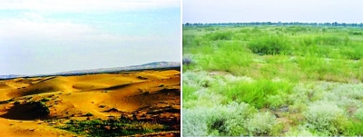 達(dá)拉特旗荒漠化綜合治理試驗(yàn)站治理前景觀,左拍攝于2001年。記者胡冬冬翻拍