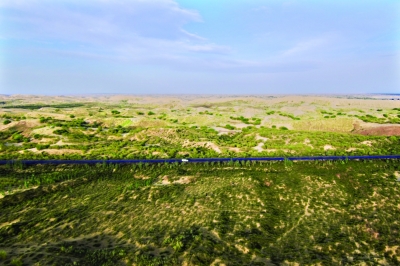 2017年9月8日,距內(nèi)蒙古林業(yè)科學(xué)研究院沙漠試驗(yàn)基地20多公里遠(yuǎn)的解柴線公路兩旁仍有大片的草地,地面也顯現(xiàn)出灰綠色。這是荒漠藻結(jié)皮后的成果,再向遠(yuǎn)處則是泛黃的綿延不絕的沙丘。記者胡冬冬攝