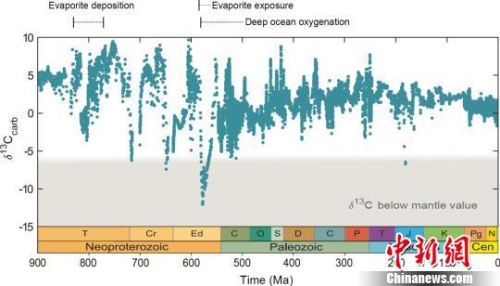 距今9億年來海水碳同位素的記錄。南古所供圖