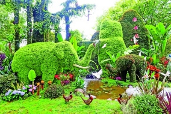 為迎接COP15的召開,100組展現(xiàn)生物多樣性保護(hù)元素的植物雕塑亮相昆明街頭。圖為翠湖公園門口的“彩云之南”。本報(bào)記者 周夢爽攝/光明圖片