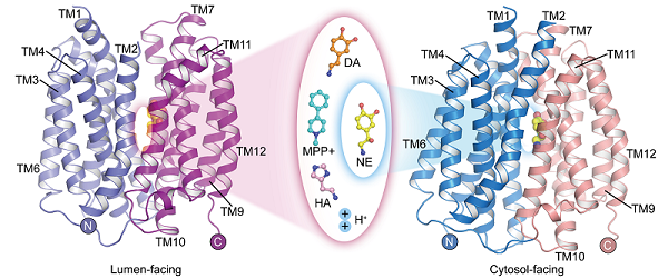 單胺類(lèi)神經(jīng)遞質(zhì)包括去甲腎上腺素、腎上腺素、多巴胺、血清素和組胺等,在神經(jīng)系統(tǒng)和其他組織中發(fā)揮著重要的生理作用。囊泡單胺轉(zhuǎn)運(yùn)蛋白(VMAT2)是中樞神經(jīng)系統(tǒng)中唯一介導(dǎo)單胺類(lèi)神經(jīng)遞質(zhì)儲(chǔ)存的轉(zhuǎn)運(yùn)蛋白。VMAT2利用質(zhì)子的電化學(xué)勢(shì),以2:1的質(zhì)子與底物的化學(xué)計(jì)量比,將神經(jīng)遞質(zhì)或神經(jīng)毒素MPP+轉(zhuǎn)運(yùn)進(jìn)入囊泡中,在介導(dǎo)神經(jīng)沖動(dòng)傳遞和神經(jīng)保護(hù)方面具有關(guān)鍵作用。