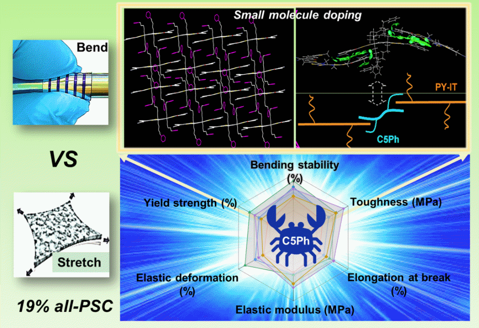 近日,中國科學(xué)院青島生物能源與過程研究所研究員包西昌帶領(lǐng)的先進(jìn)有機(jī)功能材料與器件研究組,設(shè)計具有苯基烷基側(cè)鏈的小分子作為固體添加劑,在特征側(cè)鏈的輔助下與聚合物受體產(chǎn)生的多重非共價相互作用,尤其是添加劑苯基烷基的苯基與受體端基之間形成新的非共價鍵,提高了PY-IT亞晶相的分子間作用強(qiáng)度和有序性,提升了全聚合物太陽能電池的光伏性能和機(jī)械穩(wěn)定性。通過獨(dú)立誘導(dǎo)分子堆疊和垂直相分離,偽平面異質(zhì)結(jié)的全聚合物太陽能電池實現(xiàn)了19.01%的效率和近80%的填充因子,這是當(dāng)前全聚合物太陽能電池的最高值之一。同時,科研人員探討斷裂伸長率、韌性、彈性變形、彈性模量和屈服強(qiáng)度等各種變量在應(yīng)力應(yīng)變下的變化發(fā)現(xiàn),與傳統(tǒng)斷裂伸長率和彈性模量相比,活性層的彈性形變可以更真實地反映器件的相分離自修復(fù)能力和彎曲穩(wěn)定性,這為開發(fā)具有優(yōu)異性能和機(jī)械靈活性的先進(jìn)全聚合物太陽能電池提供了研究思路。